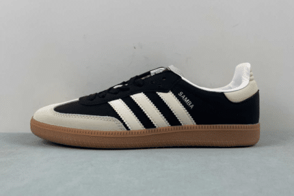 The Adidas Samba OG features a black suede upper, off-white leather overlays, and signature white three stripes. Finished with a