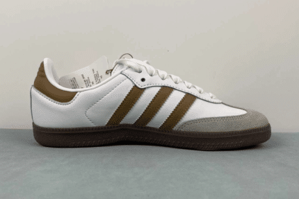 A classic sneaker with timeless appeal, featuring a white leather upper, brown Three Stripes, suede toe, and a durable gum