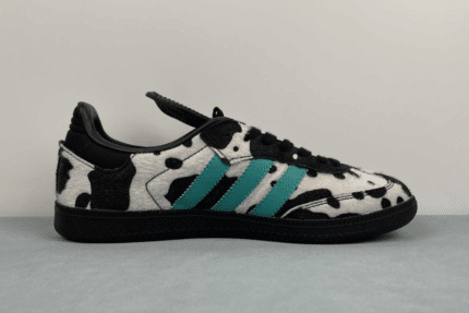 This is a unique Adidas Samba sneaker featuring a bold black and white cow print upper, accented with teal leather