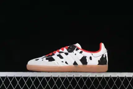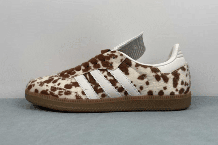 The Adidas Samba OG “Cow Print” brings a bold twist to a classic silhouette with faux fur upper, brown and