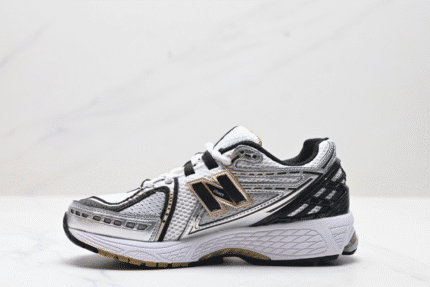 The New Balance 1906R White Black Gold Metallic combines breathable mesh with sleek black and gold accents for a bold,