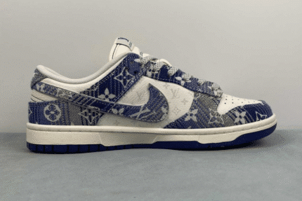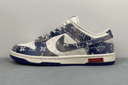 The Nike Dunk Low x Louis Vuitton “Blue” is a luxury custom sneaker that blends the classic Dunk Low silhouette