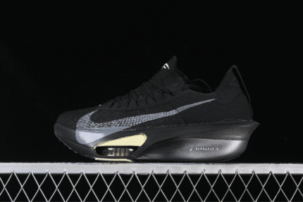 Sleek and built for speed, the Alphafly NEXT% 3 in black features Zoom Air units, a carbon plate, and ultra-light