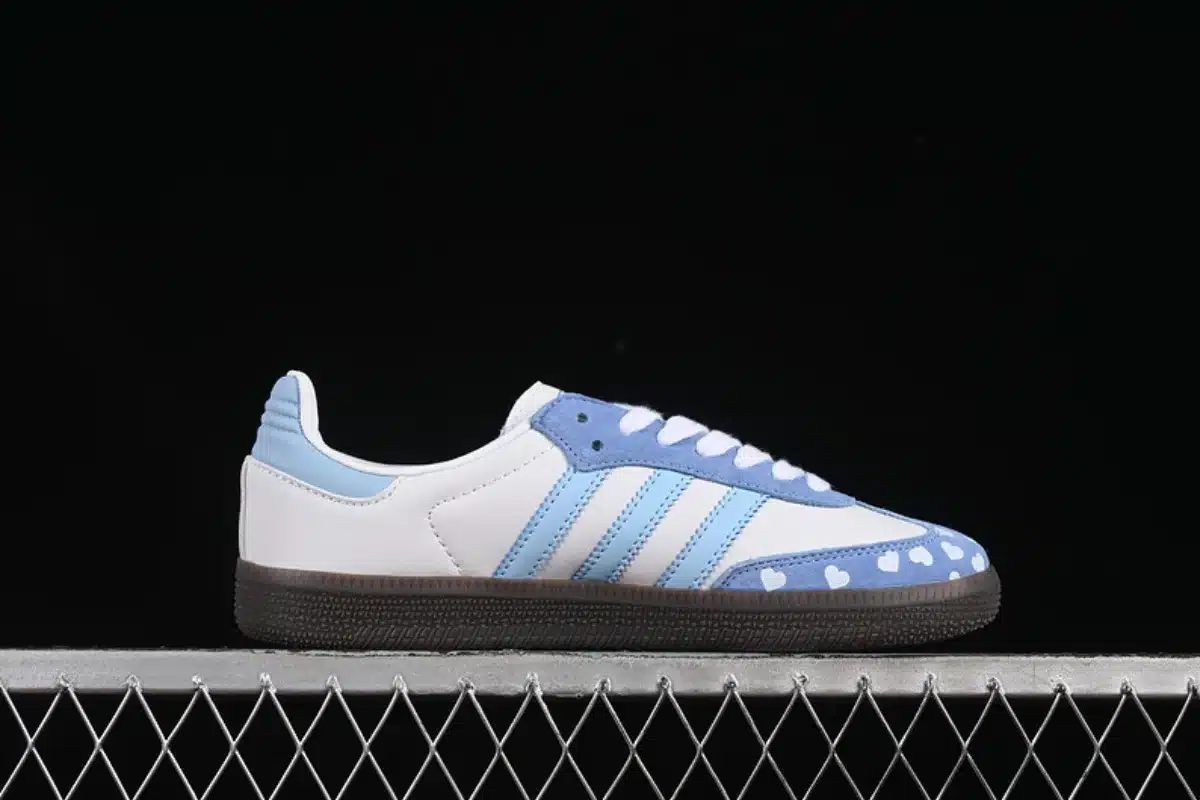Step into a fresh look with the Adidas Samba OG “Heart Blue.” This edition takes the world’s favorite indoor soccer silhouette and gives it a soft, romantic makeover. Drenched in shades of sky blue and crisp white, this sneaker is the ultimate accessory for any blue-themed outfit.