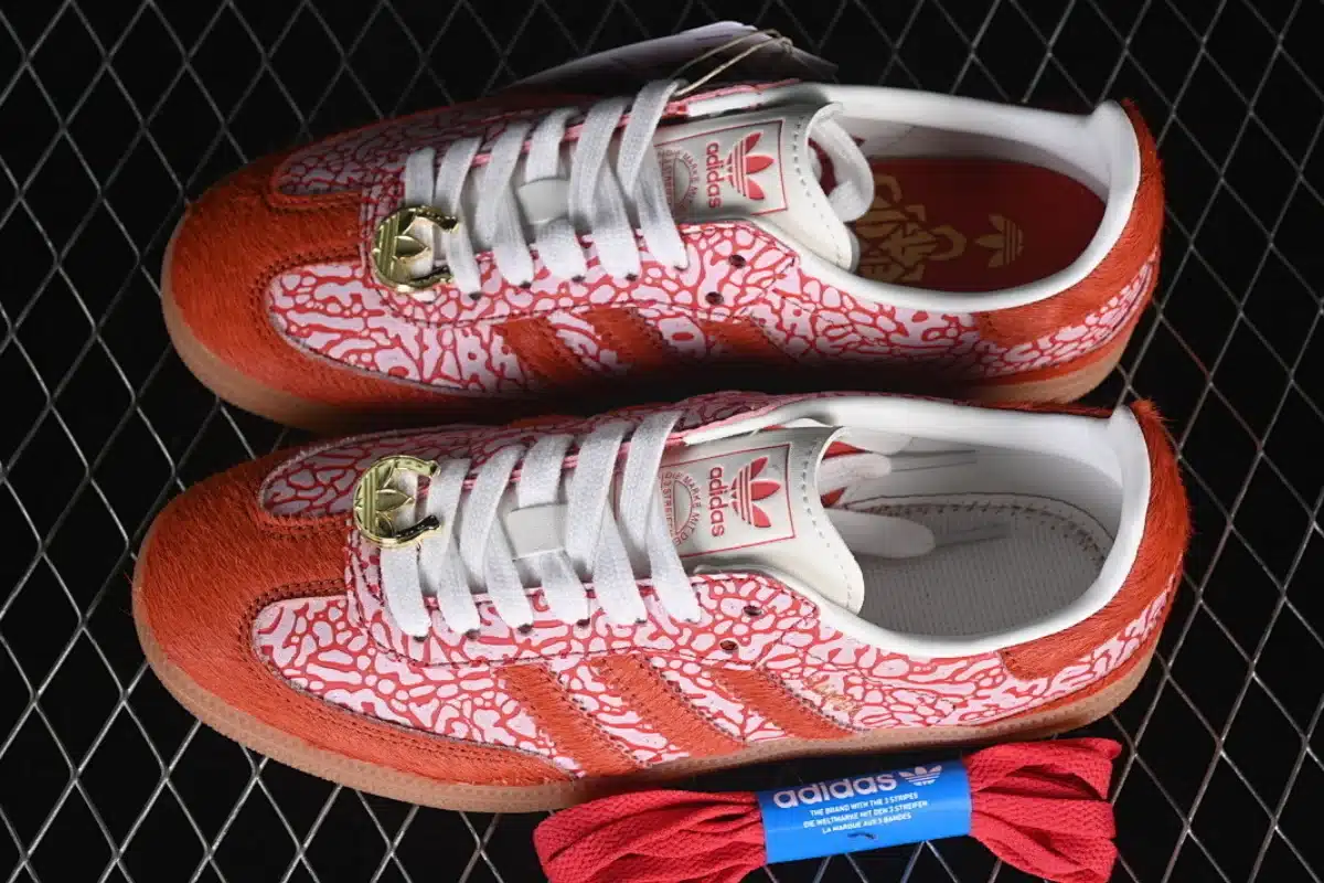 Make a bold statement with the iconic Adidas Samba OG, redesigned with a striking red patterned upper for a standout look. This eye-catching edition keeps the classic low-profile Samba silhouette while adding textured details that bring modern style to a legendary design.
