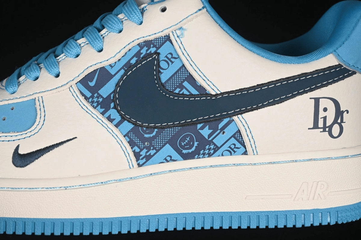 Elevate your style with this custom Nike Air Force 1 Low featuring a luxury Dior-inspired pattern. Dressed in a crisp cream and light blue colorway, it blends streetwear flair with high-end fashion for a bold and unique look.