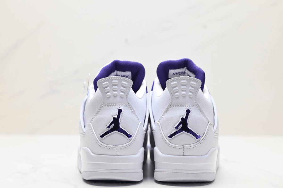 Clean and classic, the Air Jordan 4 Retro ‘Metallic Purple’ features a crisp white leather upper with vibrant purple accents, blending iconic design with a bold pop of color