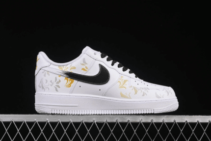 The Nike Air Force 1 ’07 Low White Black Yellow features a classic white leather upper with bold black accents