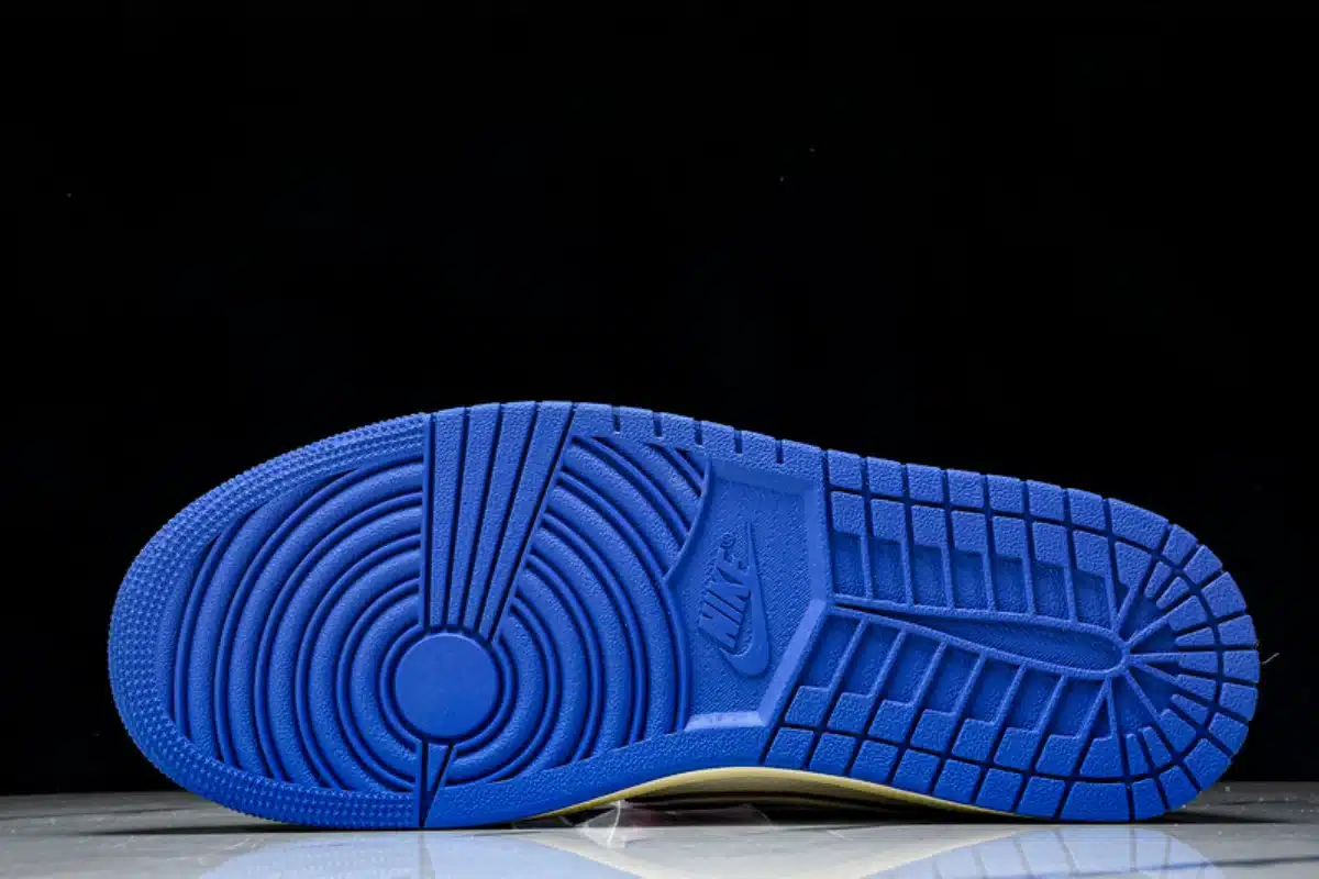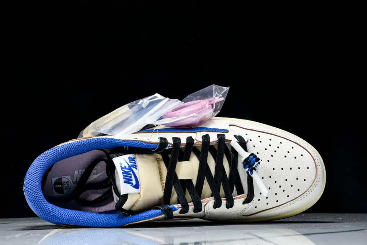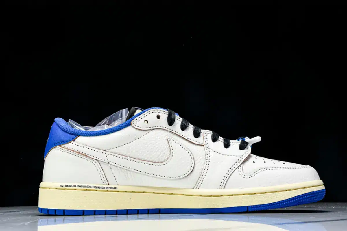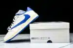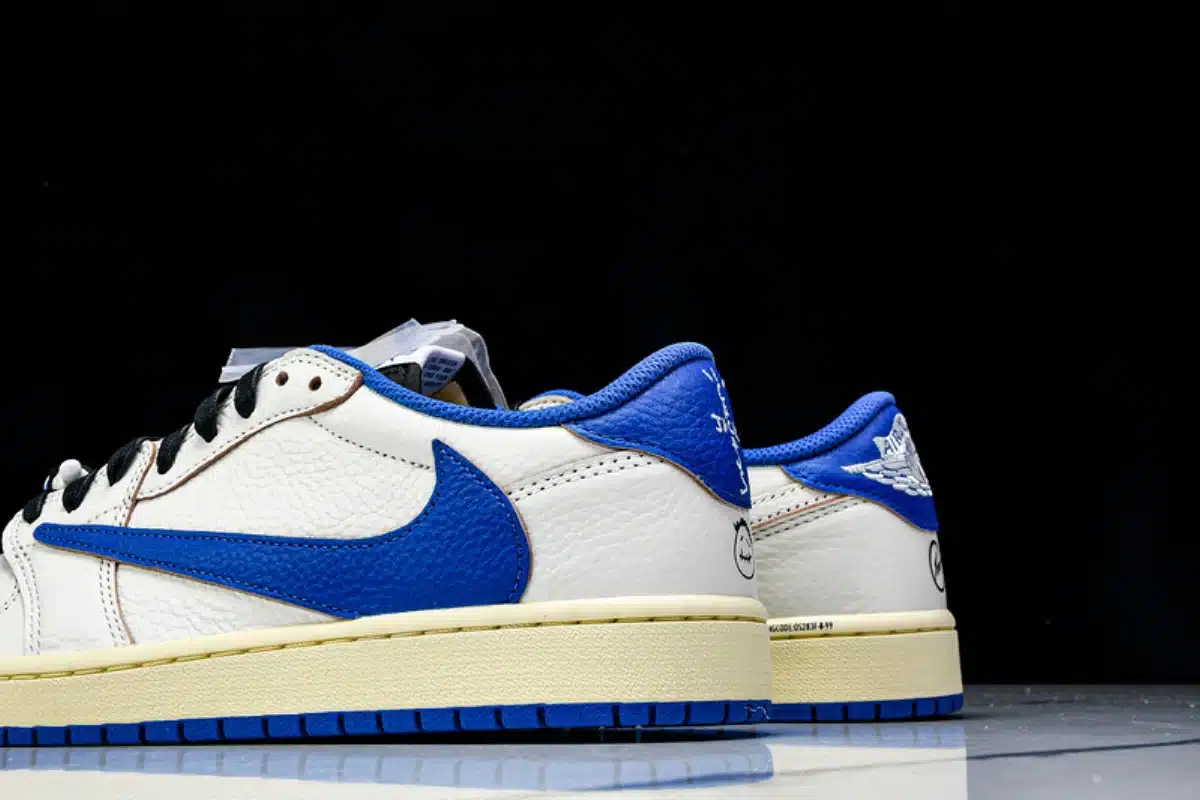The Fragment Design x Travis Scott Air Jordan 1 Low OG SP blends iconic streetwear influence with premium craftsmanship. Featuring a crisp white leather base accented by bold blue overlays and black detailing, this collaboration stands out with Travis Scott’s signature reverse Swoosh and Fragment Design’s minimalist branding.
