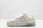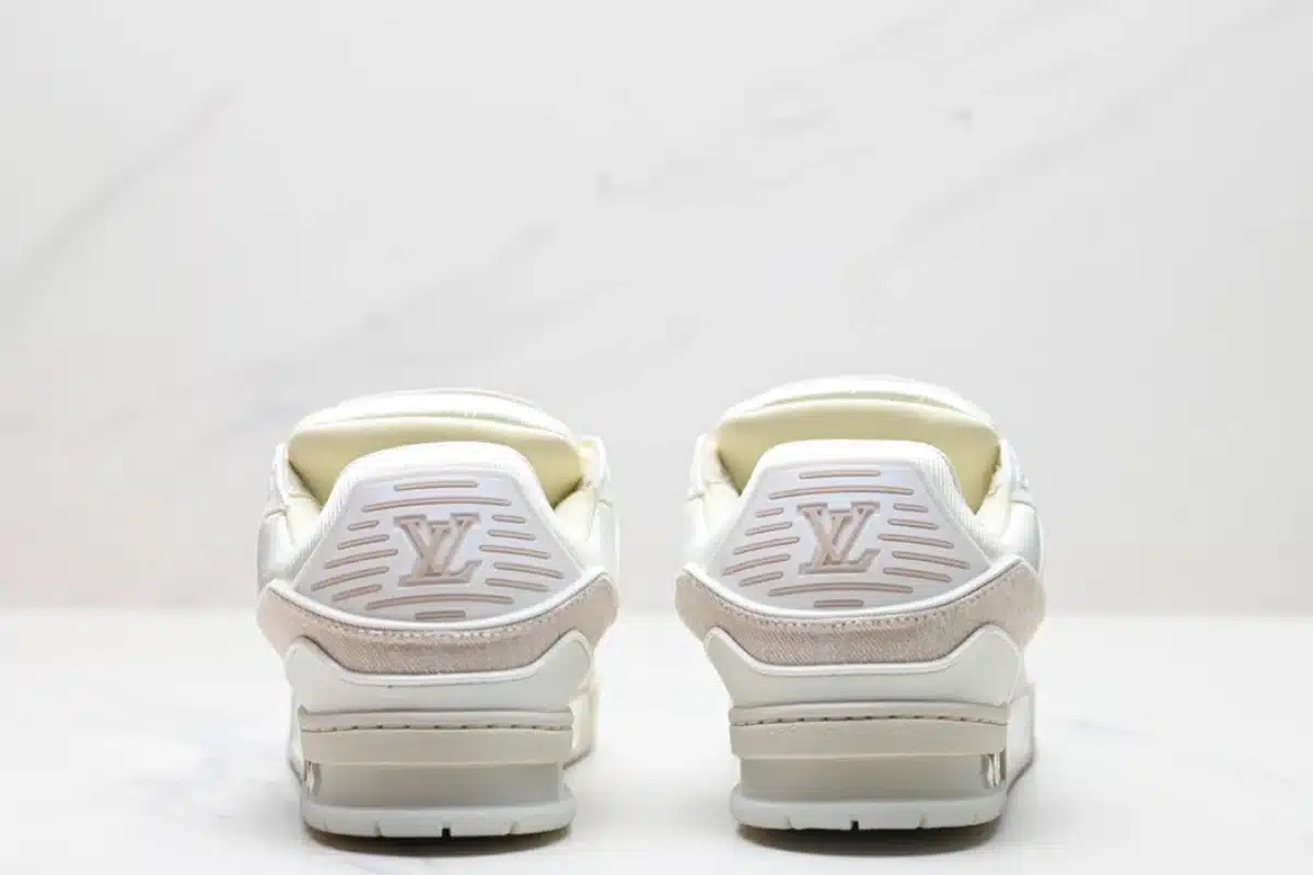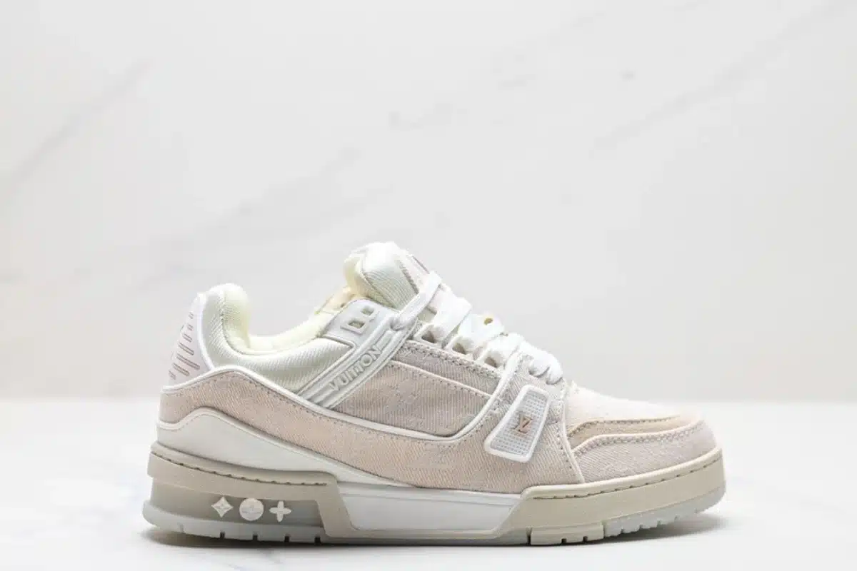 The Louis Vuitton LV Trainer Sneaker in Beige features a premium blend of materials, including monogram-textured textile and smooth leather. Designed for both comfort and luxury, it combines classic streetwear style with the iconic elegance of Louis Vuitton branding.