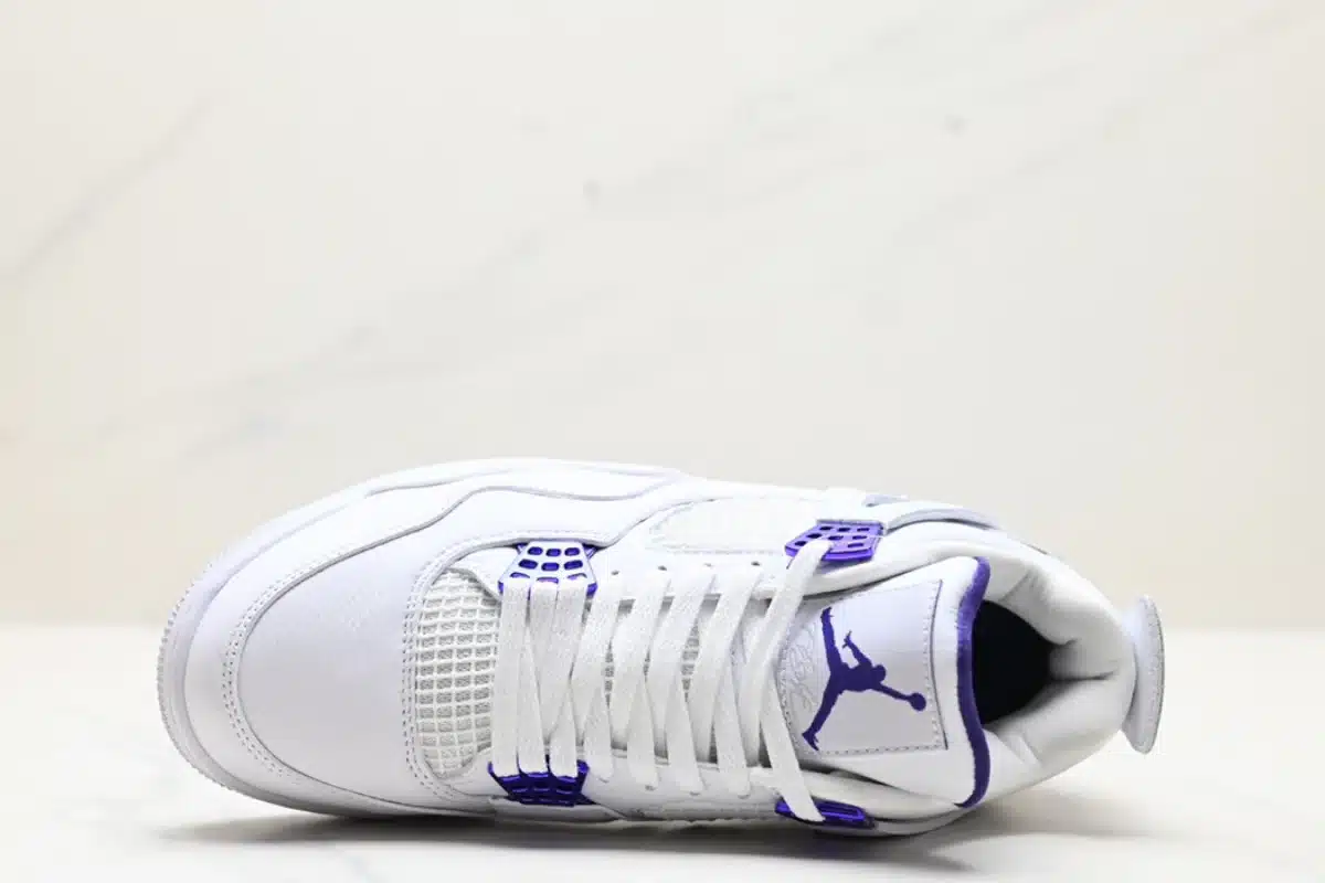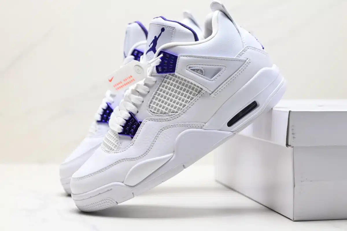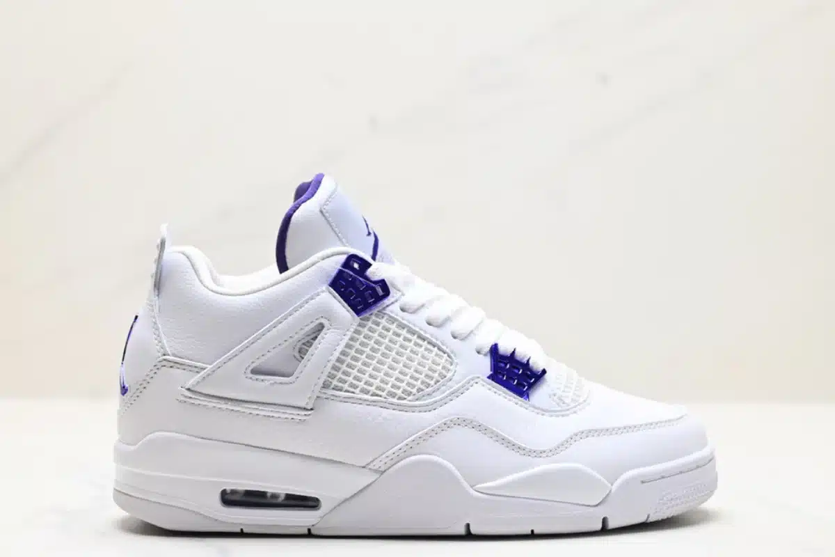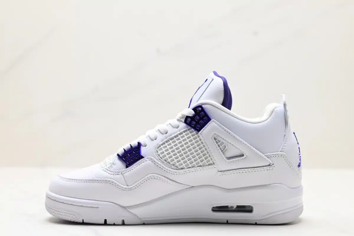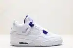 Clean and classic, the Air Jordan 4 Retro ‘Metallic Purple’ features a crisp white leather upper with vibrant purple accents, blending iconic design with a bold pop of color