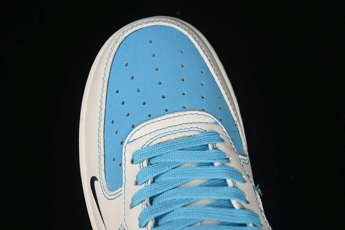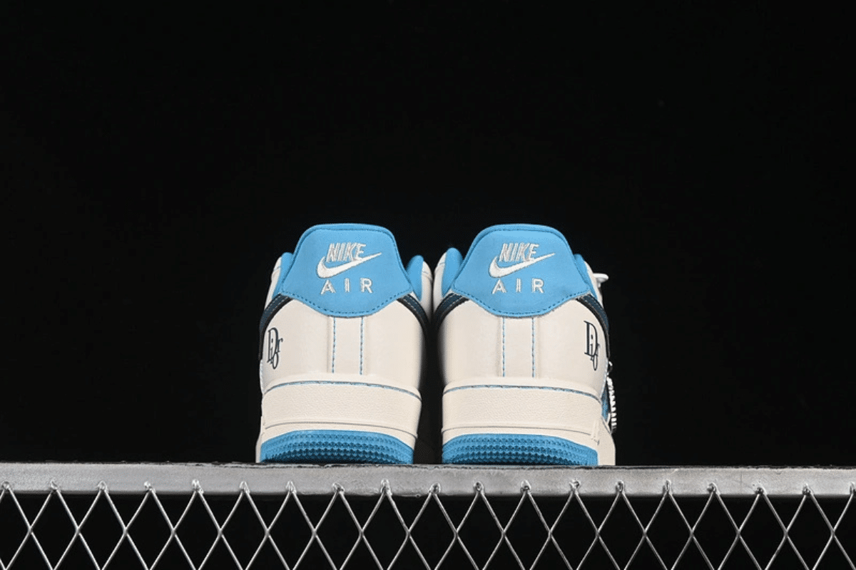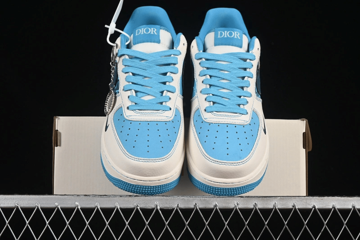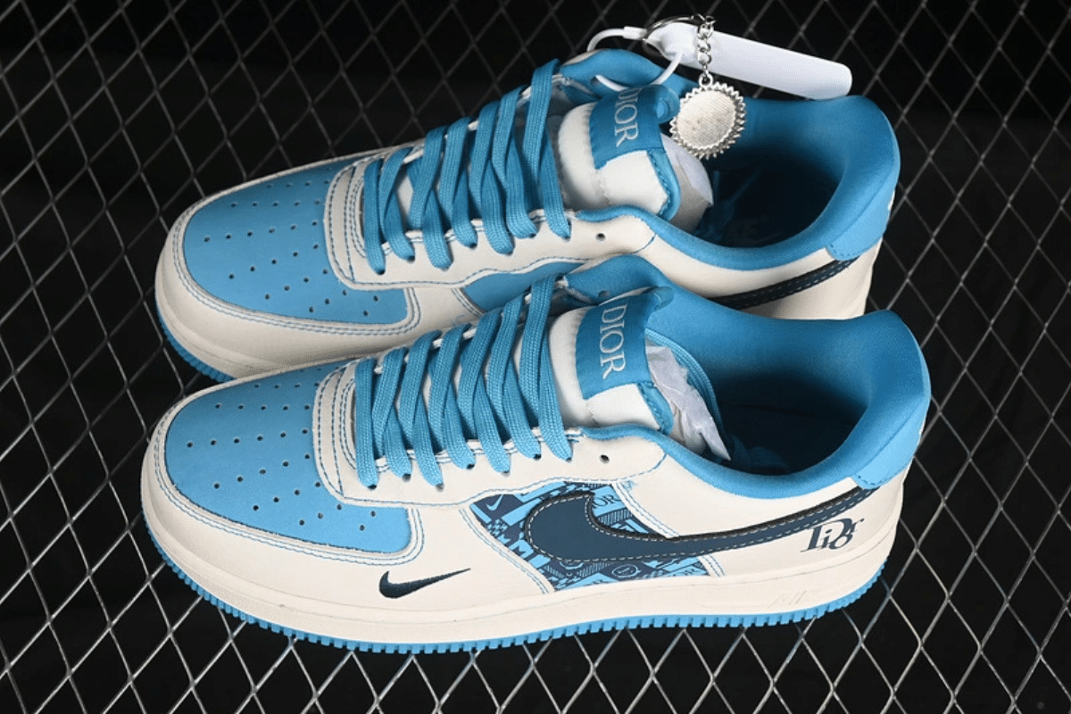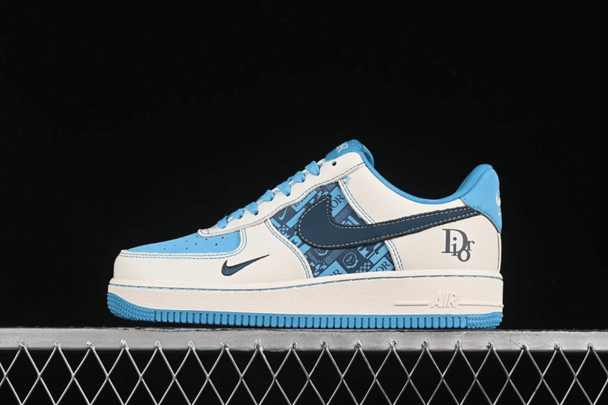 Elevate your style with this custom Nike Air Force 1 Low featuring a luxury Dior-inspired pattern. Dressed in a crisp cream and light blue colorway, it blends streetwear flair with high-end fashion for a bold and unique look.