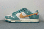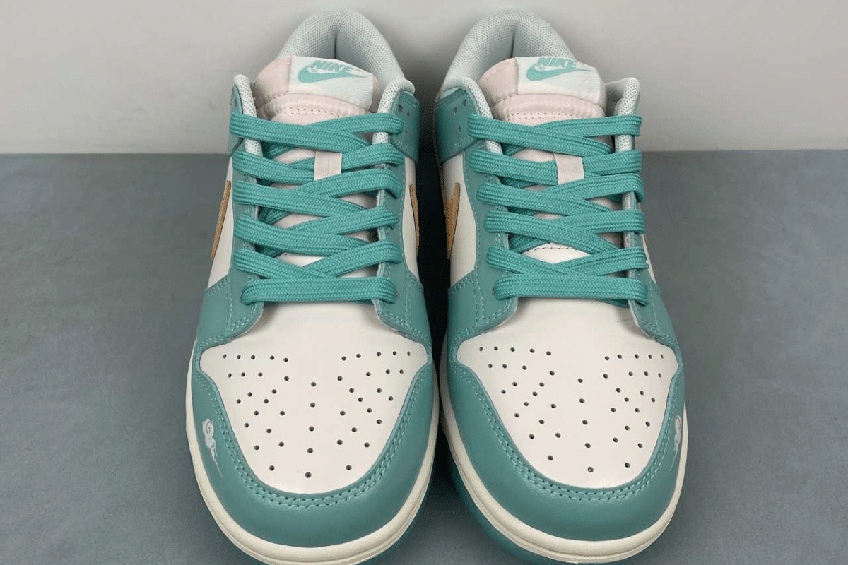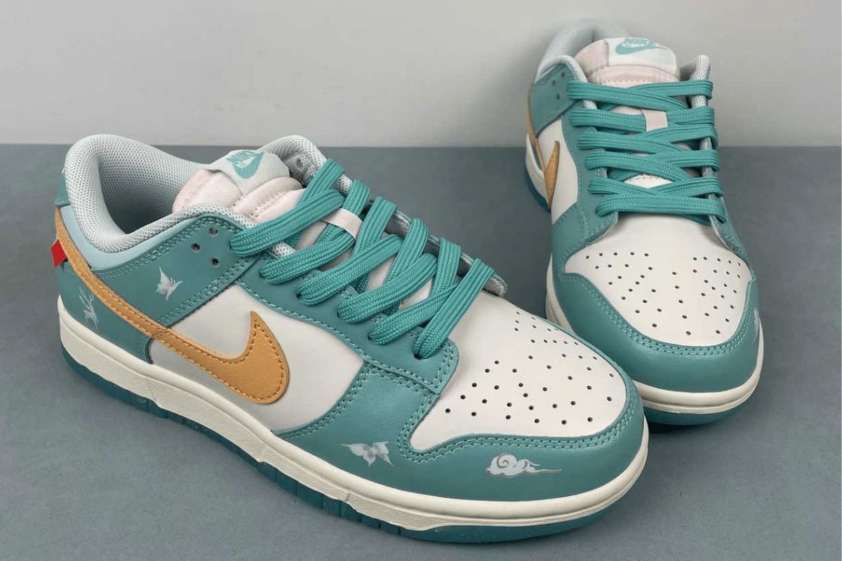 Step out in style with the Nike Dunk Low Teal White – Custom Edition. Featuring a refreshing teal and white leather upper with a bold mustard yellow Swoosh, this sneaker blends comfort and street-ready fashion. Perfect for everyday wear or making a statement.