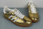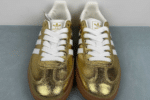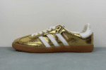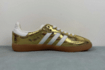 Stand out in style with the Adidas Samba OG featuring a bold metallic gold upper, classic white three stripes, and a timeless gum sole. Perfect for streetwear lovers and sneaker collectors.