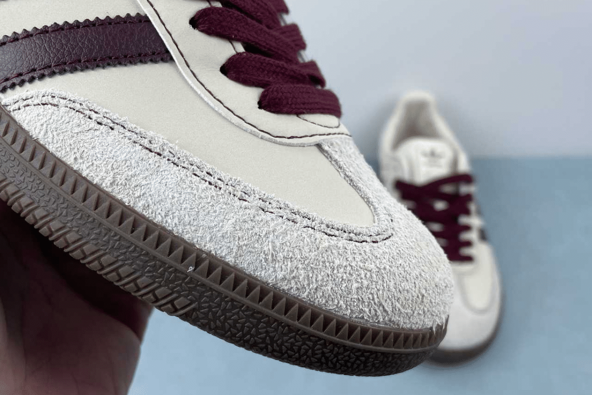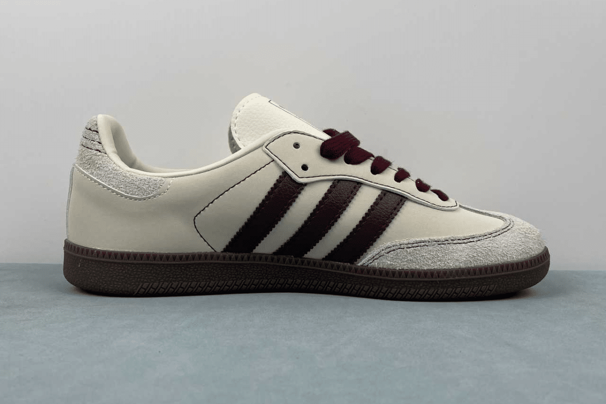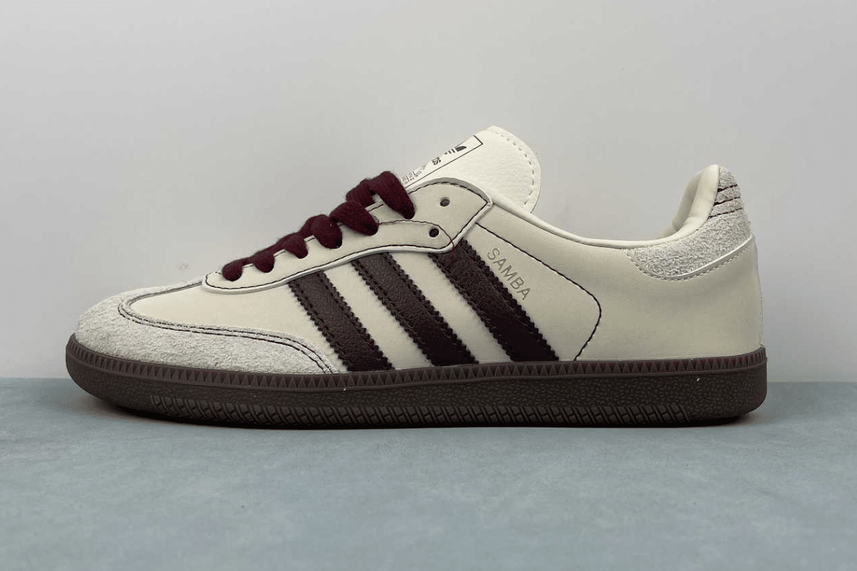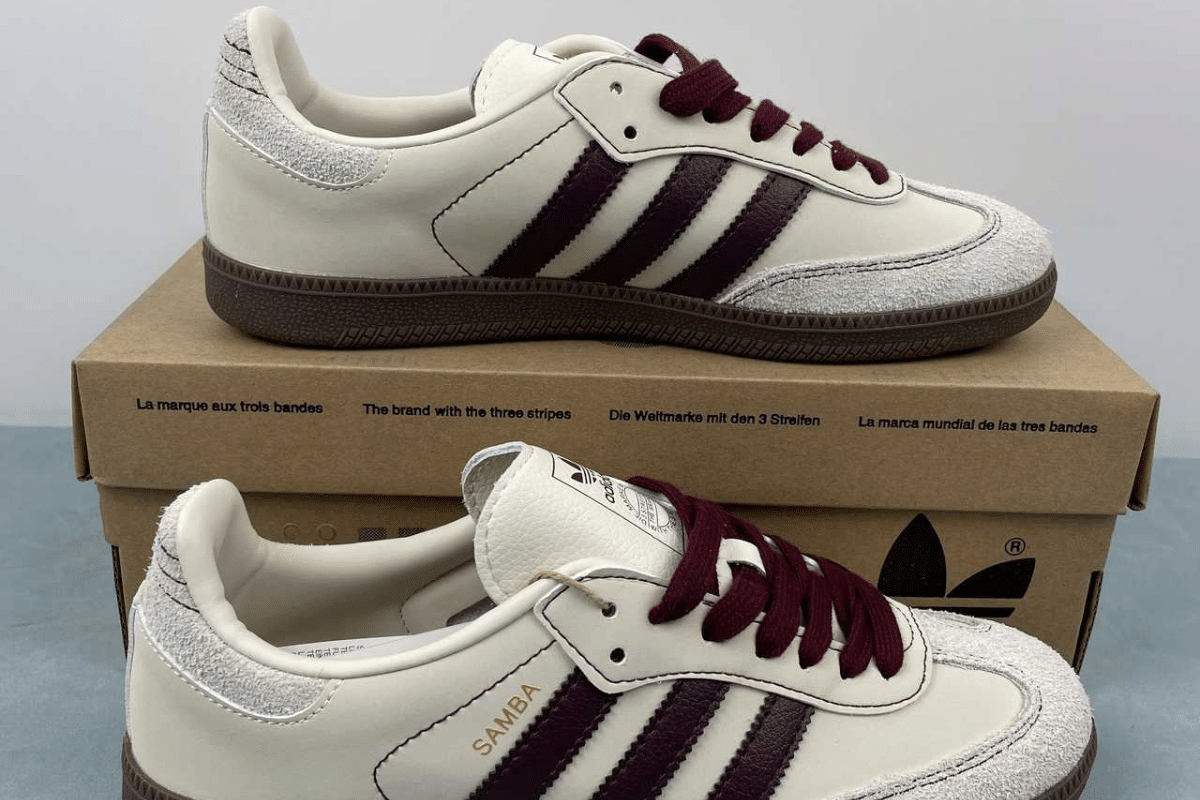 The Adidas Samba OG White Maroon Gum features a smooth off-white leather upper, rich maroon three-stripe branding and laces, grey suede overlays, and a classic gum rubber sole. A clean and timeless sneaker with a bold twist.