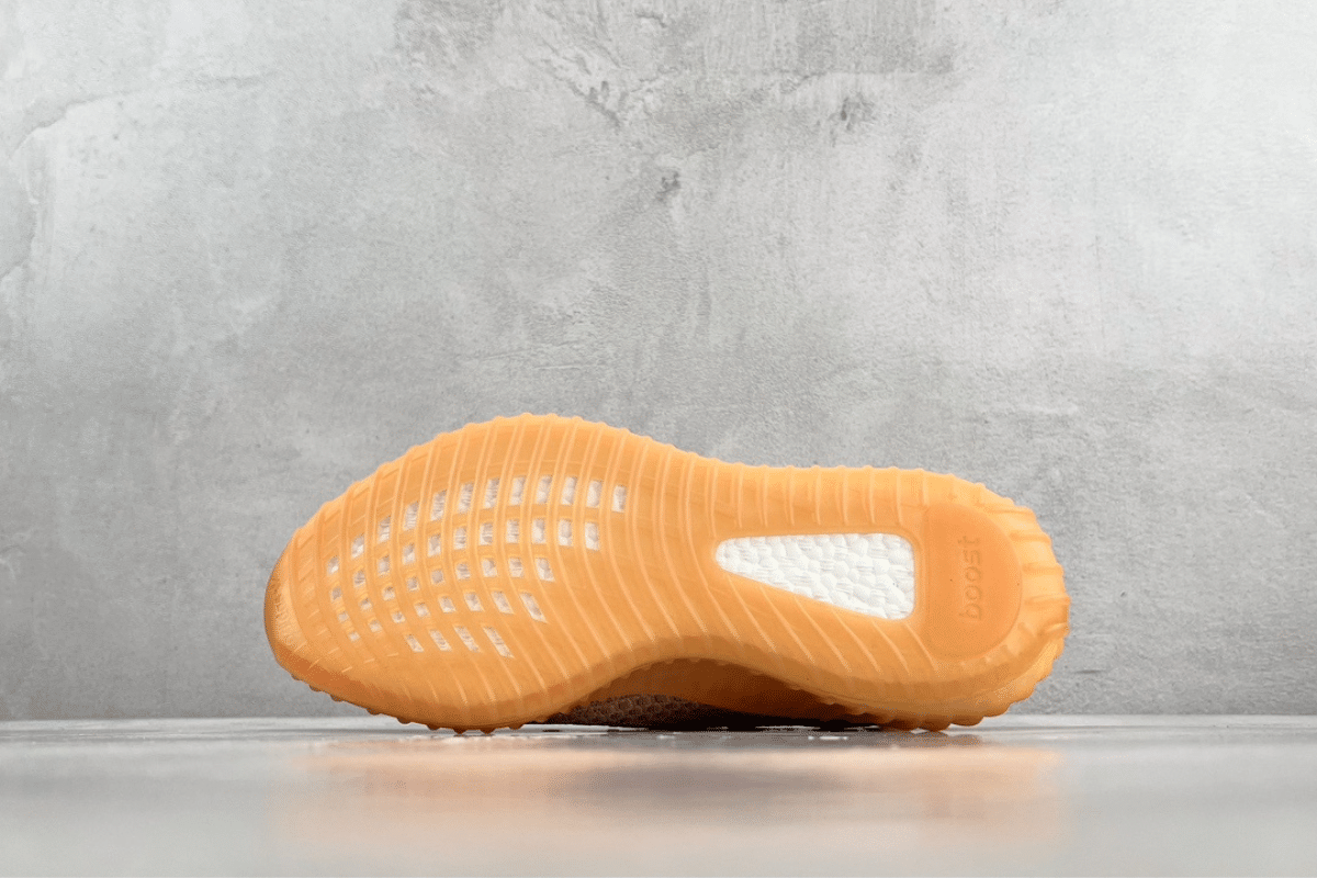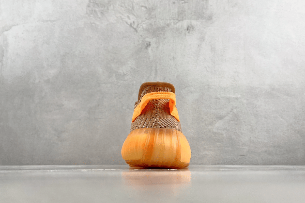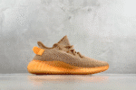 This is the Adidas Yeezy Boost 350 V2 “Clay,” featuring a tan Primeknit upper, signature translucent stripe, and a vibrant orange heel tab and sole. A stylish blend of comfort and standout design.