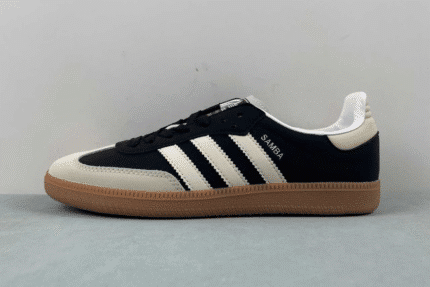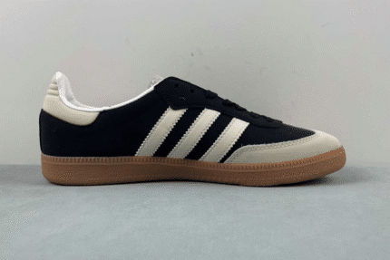 The Adidas Samba OG features a black suede upper, off-white leather overlays, and signature white three stripes. Finished with a